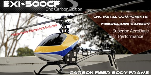 Ultra lightweight carbon fiber frames and metal blade grips with thrust bearings are two examples of the quality features designed into this great helicopter! Carbon Fiber Frame Version Kit Includes:EXI 500 CF KitMain Rotor Blades NOT included. This is a kit version, assembly required. (the factory already completed the assembly for the rotor head, tail section, and main frame, you just need to put in the tail boom, main gear, and landing skid Features Electric Power System Simple lightweight design provides an awesome flight performance and extreme 3D capability Rigid Carbon Fiber Frame design Beautiful Factory Painted Fiberglass Canopy Rotor head/tail with thrust bearings Direct to swash CCPM linkage Center of gravity battery tray designed close to the rotor head Tail rotor drive belt system Fully driven tail auto rotation system Tail servo mount boom CNC-Complete Rotor Head CNC-Complete Tail Assembly CNC Aluminum Tail-Boom Holder Specifications:Length: 850mmHeight: 310mmMain Blade Length: 425mmMain Rotor Diameter: 970mmTail Rotor Diameter: 200mmMotor Drive Gear: 12T/13TMain Drive Gear: 162TAutorotation Tail Drive Gear: 145TTail Drive Gear: 31TDrive Gear Ratio: 1:13.5:4.68/1:12.46:4.68Weight(w/o power system): 935gFlying Weight: Approx 1700gRadio transmitter and electronic equipment required for assembly:Transmitter(6-channel or more, helicopter system)Receiver(6-channel or more)Mini servo (3)Head lock gyroSpecialized Tail ServoPitch gauge60A Brushless ESC500 size Brushless motor (1600KV)22.2V 6S Li-Poly 2100~2500mAh battery425mm main blade Complete CNC-Rotor Head Complete CNC-Tail Assembly Carbon Fiber Frame Complete CNC Tail Boom Assembly
